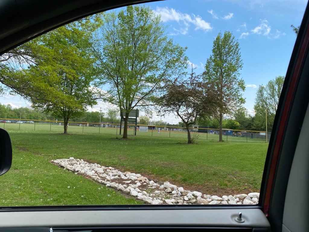 Monday we all made it to the baseball game. The boys and I came later once the game was started. They carried ponchos and umbrellas off to the bleachers while I stayed in the car and listened to the radio and watched the game. After about a half hour I went a little closer and sat in the grass for another half hour, feeling very much at home. I got up to leave just about the time the tornado sirens went off and they called the game.