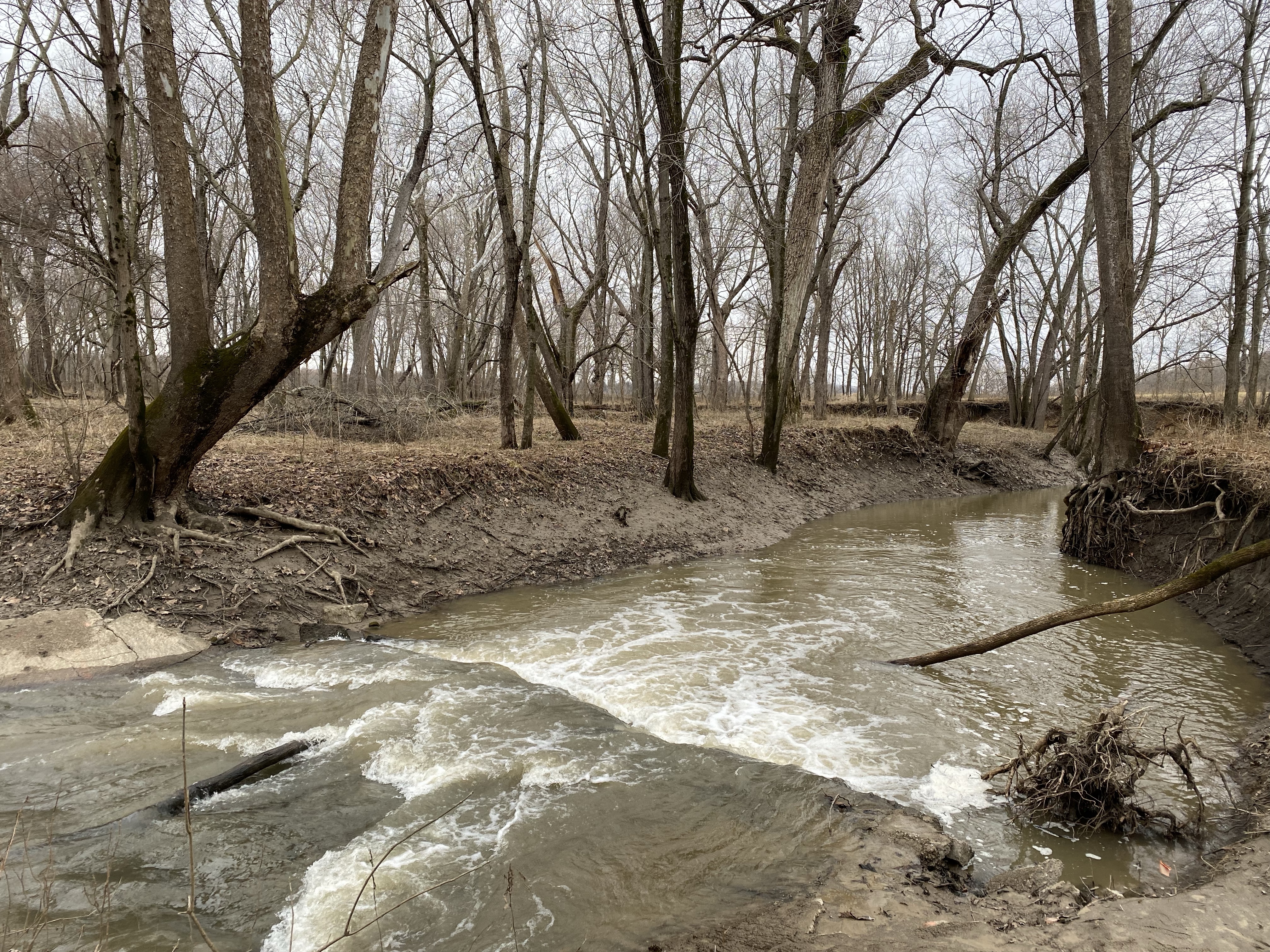 I say I don’t care that it isn’t yet spring, and I don’t, though March is that month where I start to run out of juice. I’ve basically been loving every month since July. I got up at 5:30 when Josh’s alarm goes off. He had to leave early for a chapel visit a couple of hours away. This was the big kids’ late day, where they don’t have to be at school until 9. They left around 8:20 because they like to be there early. With the boys settled and working on school, I went back to bed and fell asleep. I woke up when Josh got back a little before lunch. We talked about a marriage situation happening with another couple we know, as everybody made and ate their lunch. After that we all went down to the woods to collect sap. I couldn’t hear the creek like last time. When we drove back over to look at the creek, it made us stop to not only hear but to see the difference. The rapids had become a calming green.