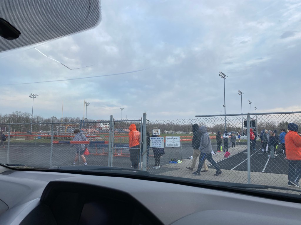 I asked if he’d disown me if I wore sweatpants to the track meet. I don’t remember what he said, but it was something that communicated to me in a quick and believable way that he wouldn’t. We were on our way out the door, and I was readying myself at the last minute making sure I was wearing the proper apparel for the weather. I layered up, with my black leggings underneath, and my grey sweatpants on top for added warmth.