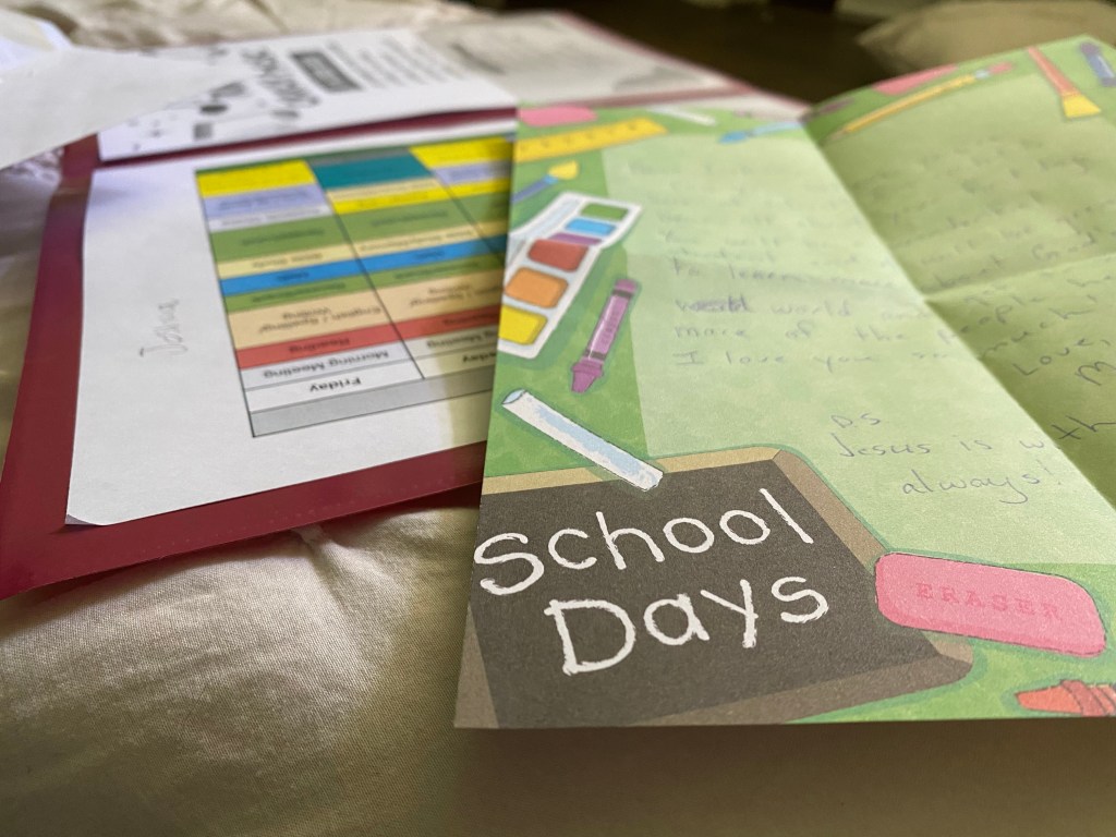 This morning I went to the Y and swam. This was the second time I’ve gone this week. The grade school is only a few miles away from the Y, which is a different one than I have gone to in past times. Even more than walking, where my legs and heart must carry the extra weight of my upper body, the non-weightbearing activity I’m allowed in the water feels to me doable and healing right now. The paddle-boarding has also been good. Overall school for everyone here has been going well. I’ve got an assignment due this weekend where we’re supposed to use our readings and scholarly articles to write a 5-page paper about self-care. Five doesn’t seem like enough pages to cover that, but I’m also glad it doesn’t have to be any longer. That’s what I’m needing to get started on now.