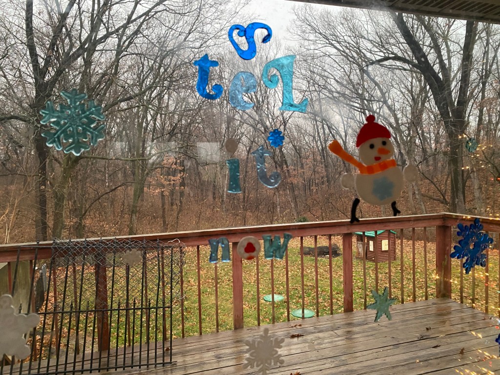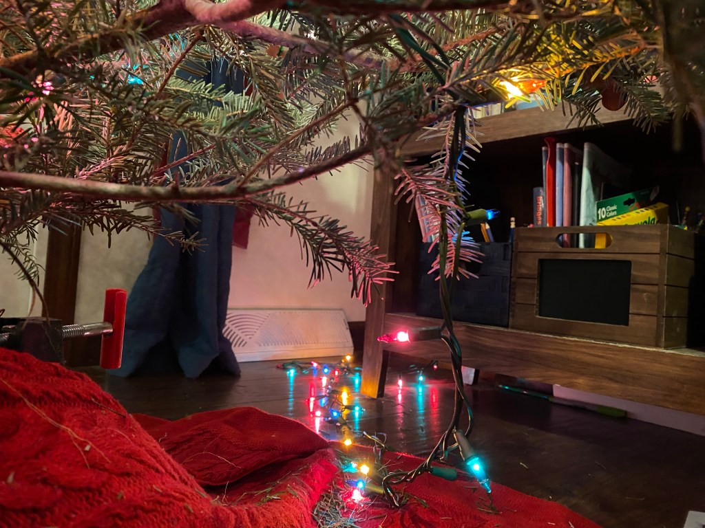 The kids helped my mother-in-law put up her Christmas tree. She didn’t want to do the big one this year. There are extra pieces of furniture in her living room that are waiting for homes in the new house which is getting closer to being completed on the inside. Something happened with the original lights so they restrung it using whatever they had. The top part of the tree has blue lights and the bottom part has clear lights. I liked that it was a little unconventional.
