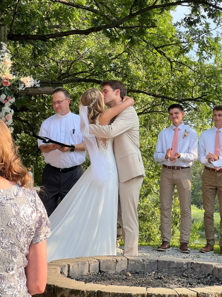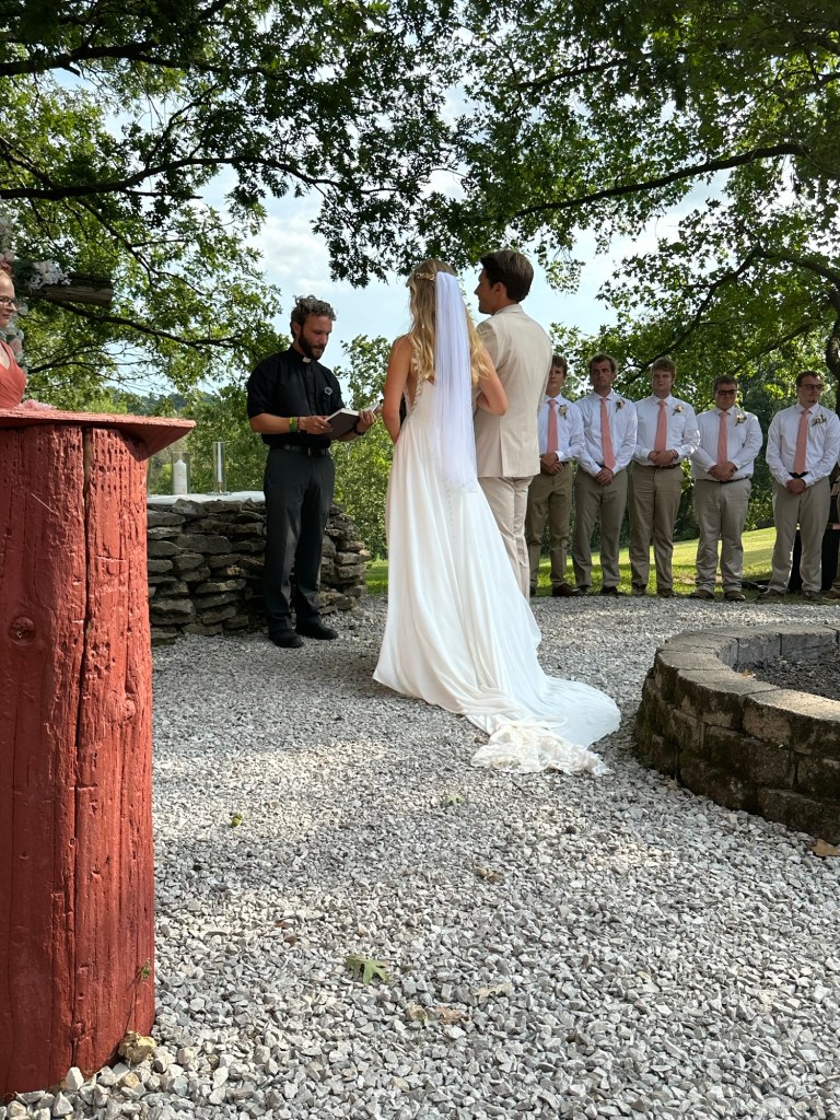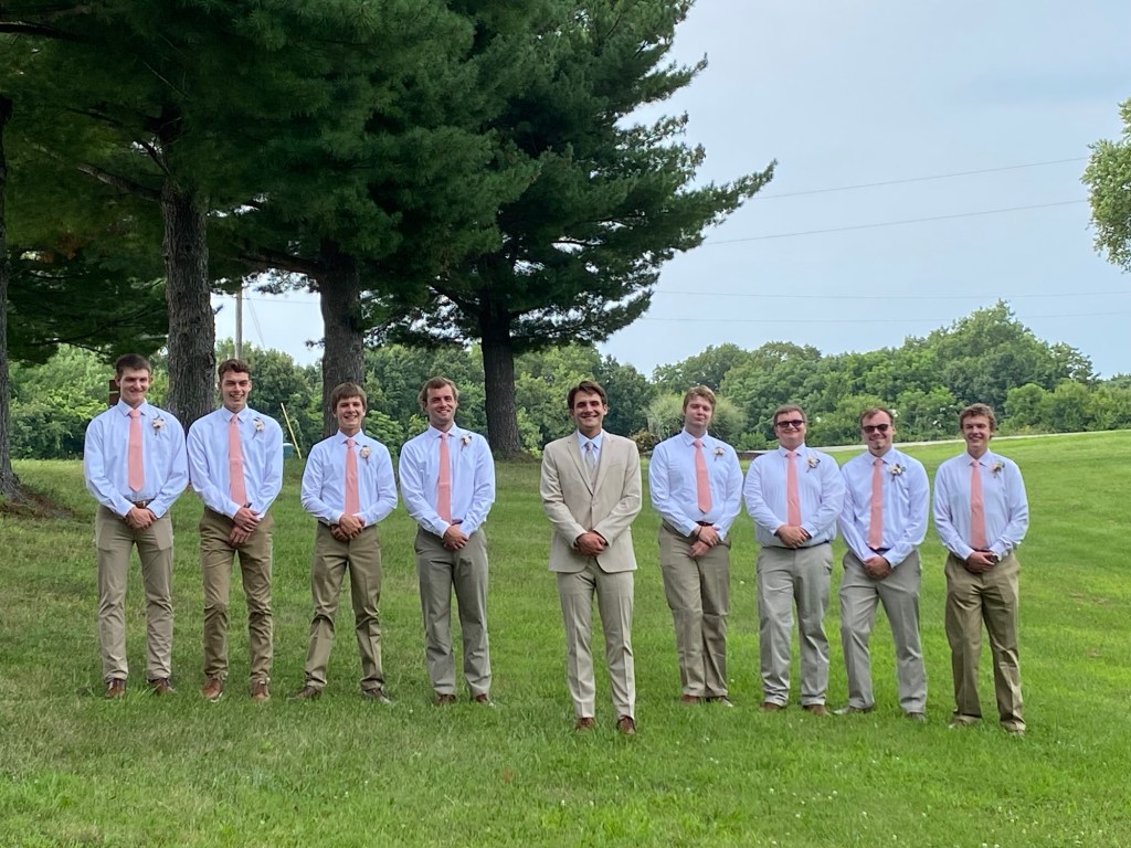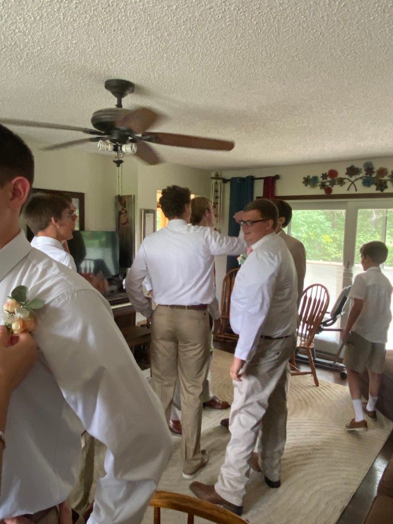 Many of the details are already fading from memory. The groomsman were here getting ready in our room. I put a few things in our closet, vacuumed the rug, and just told them that they could get ready in there. Besides Miles who was a high a school friend, and one of my sons, the rest of the groomsmen were friends from camp. Laura’s brother was supposed to be also but his spot was given to another camp friend, Logan.